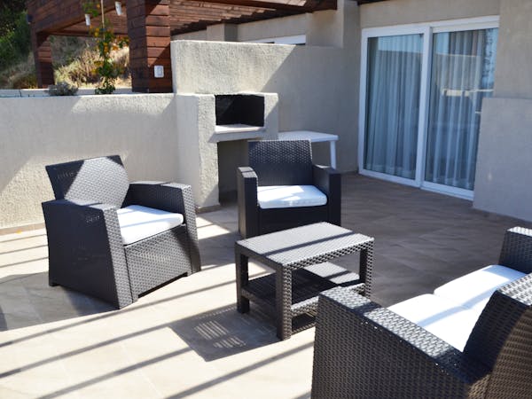Departamento de dos ambientes: un ambiente dormitorio matrimonial, baño en suite. Segundo ambiente, living comedor, cocina equipada. Terraza vista al mar con parrilla para asados..