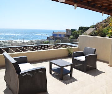 Departamento de dos ambientes: un ambiente dormitorio matrimonial, baño en suite. Segundo ambiente, living comedor, cocina equipada. Terraza vista al mar con parrilla para asados..