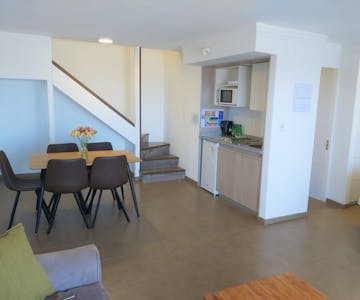 Departamento de dos ambientes: Primer piso cama matrimonial baño en suite, living comedor, cocina equipada. Terraza vista al mar. Segundo Piso Dormitorio Matrimonial Baño en suite, Balcón vista al mar.